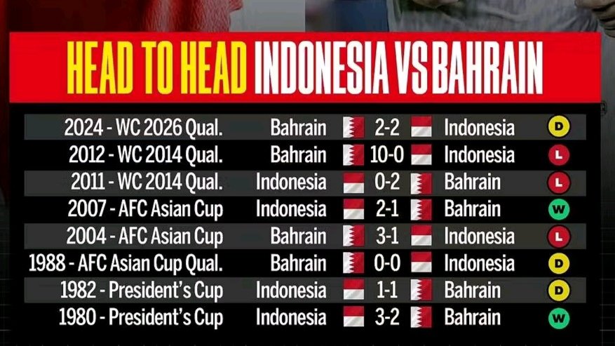 Secara keseluruhan, rekor pertemuan Indonesia dan Bahrain menunjukkan persaingan yang cukup sengit, dengan Bahrain memiliki keunggulan dalam pertandingan kompetitif. Meski demikian, hasil imbang di Kualifikasi Piala Dunia 2026 menjadi indikasi bahwa Timnas Indonesia kini mampu bersaing lebih baik melawan tim dari Timur Tengah tersebut.